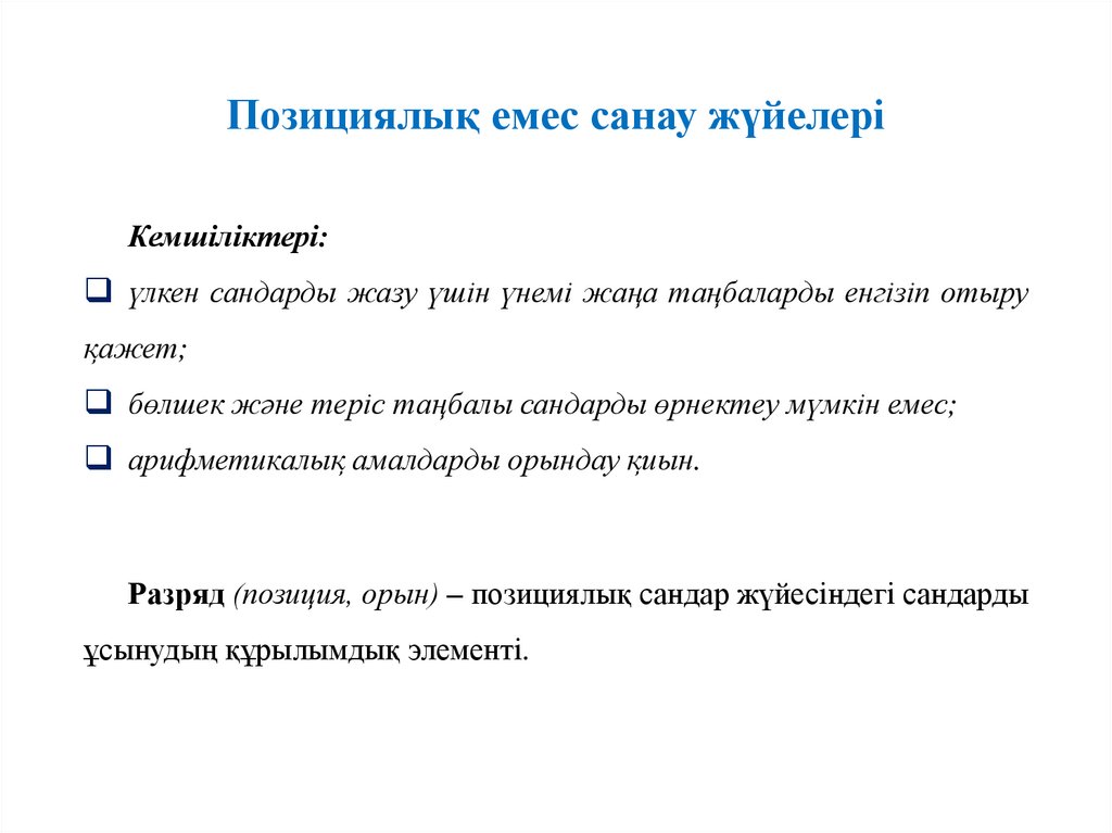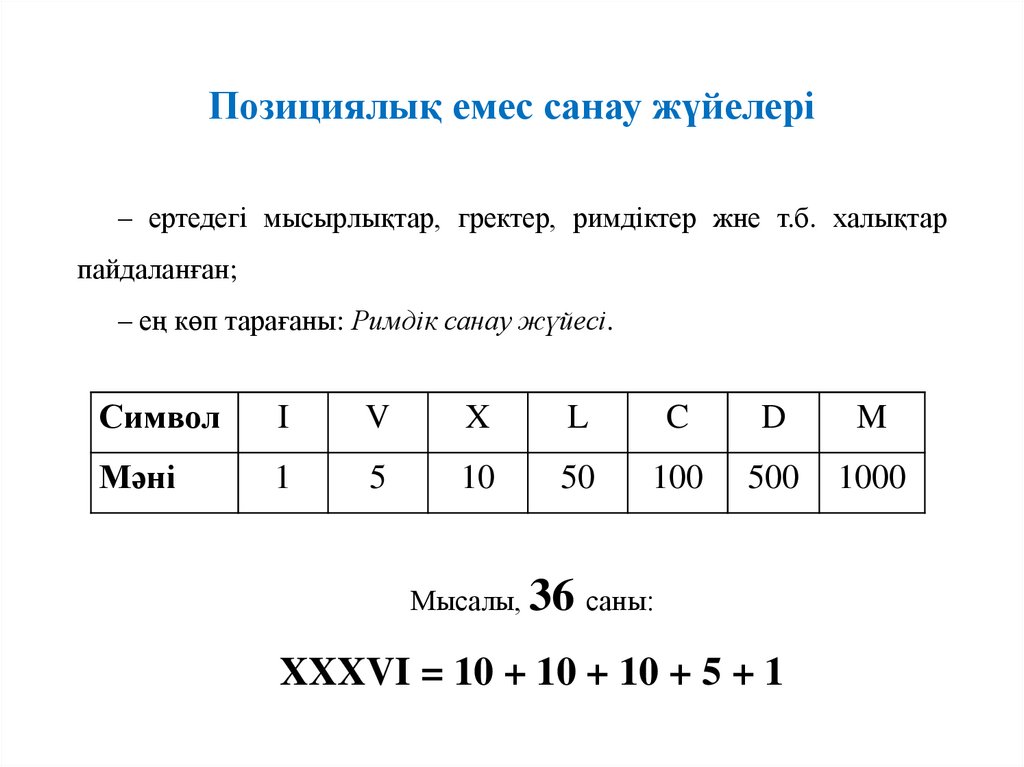 Позициялық емес санау жүйелері– ертедегі мысырлықтар, гректер, римдіктер жне т.б. халықтар