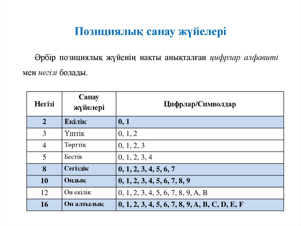 Позициялық санау жүйелеріӘрбір позициялық жүйенің нақты анықталған цифрлар алфавиті