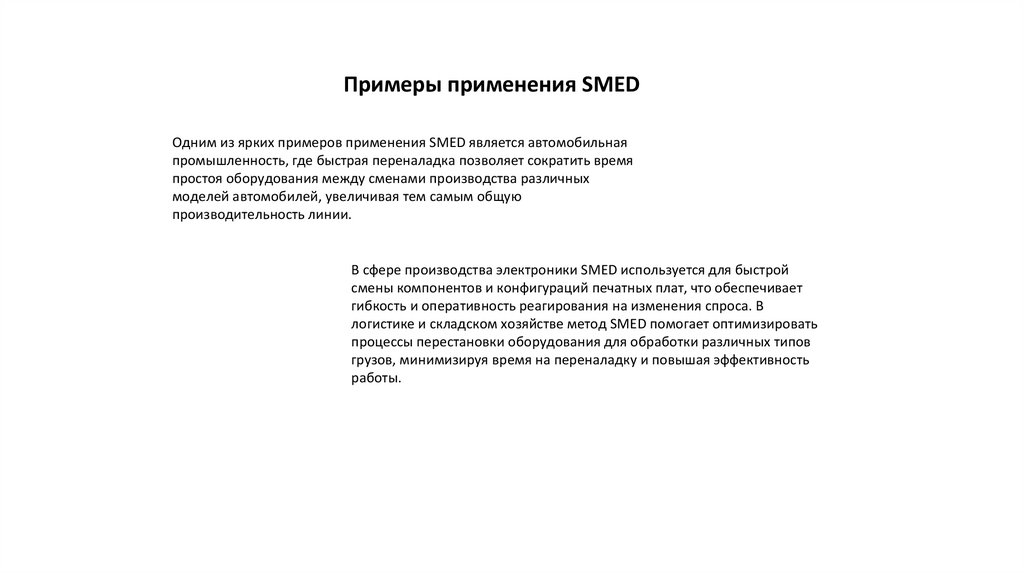 Примеры применения SMEDОдним из ярких примеров применения SMED является автомобильная