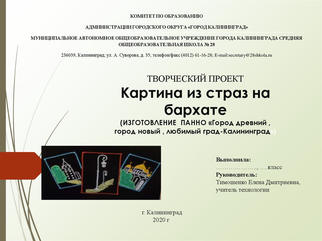 236039, Калининград, ул. А. Суворова, д. 35; телефон/факс (4012) 61-16-28; E-mail:secretary@28shkola.ru