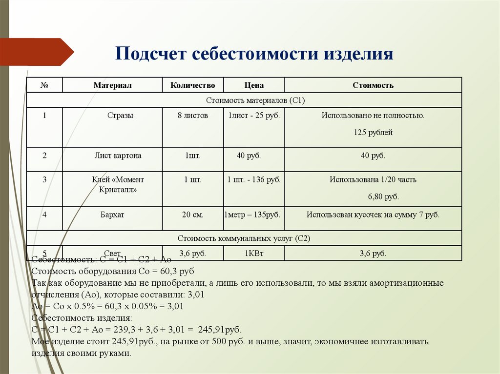 Мое изделие стоит 245,91руб., на рынке от 500 руб. и выше, значит, экономичнее изготавливать