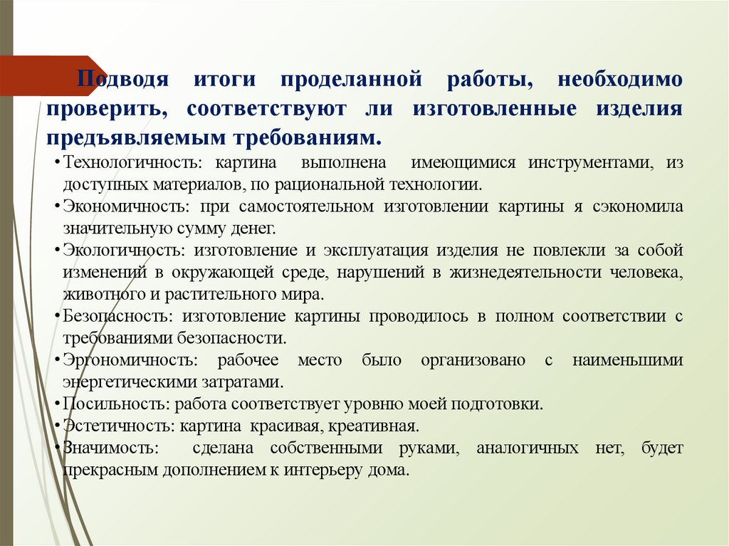 Подводя итоги проделанной работы, необходимопроверить, соответствуют ли изготовленные изделия