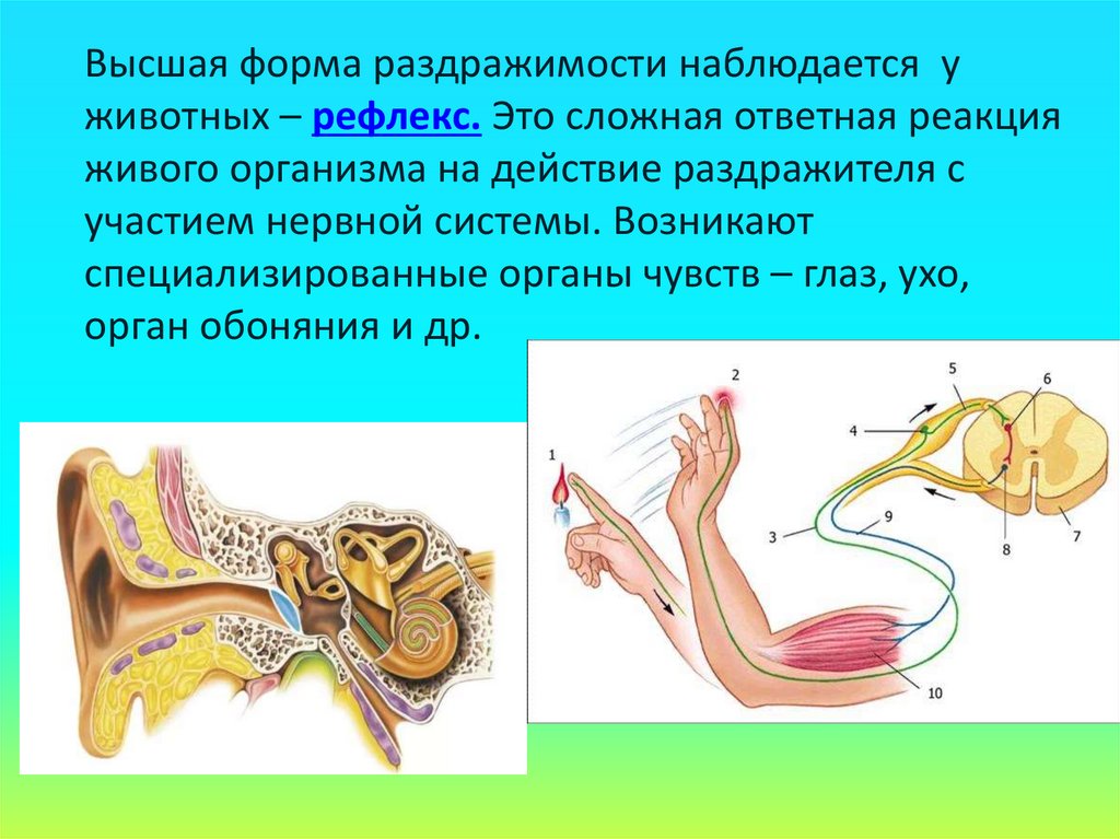 Высшая форма раздражимости наблюдается уживотных – рефлекс. Это сложная ответная реакция