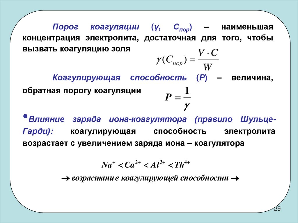 Порог коагуляции (γ, Спор) – наименьшаяконцентрация электролита, достаточная для того, чтобы