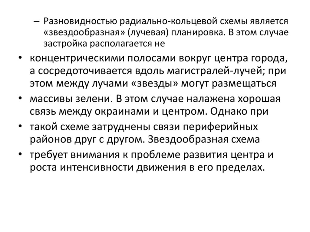 – Разновидностью радиально-кольцевой схемы является«звездообразная» (лучевая) планировка. В этом случае