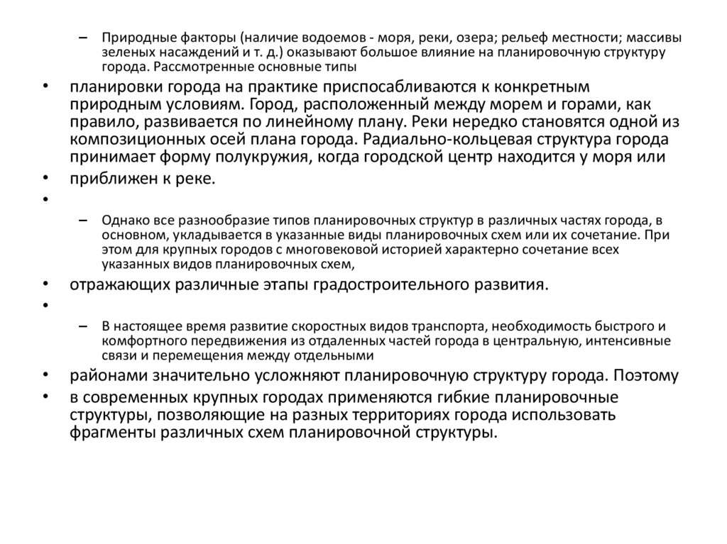 – Природные факторы (наличие водоемов - моря, реки, озера; рельеф местности; массивызеленых насаждений и т. д.) оказывают большое влияние на планировочную структуру