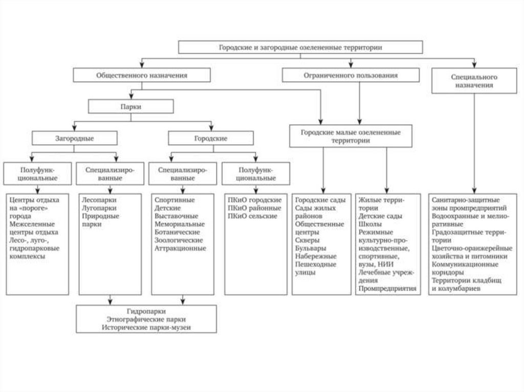 общего пользования - общегородские и районные парки, специализированныепарки; городские сады и сады жилых районов, межквартальные сады, сады при