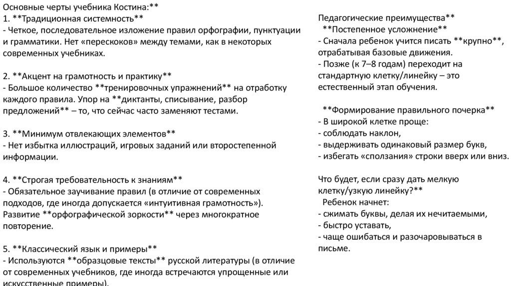 Основные черты учебника Костина:**1. **Традиционная системность**