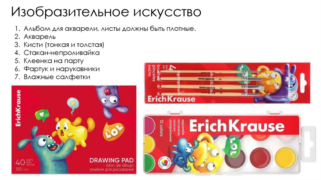 Изобразительное искусство1. Альбом для акварели, листы должны быть плотные.