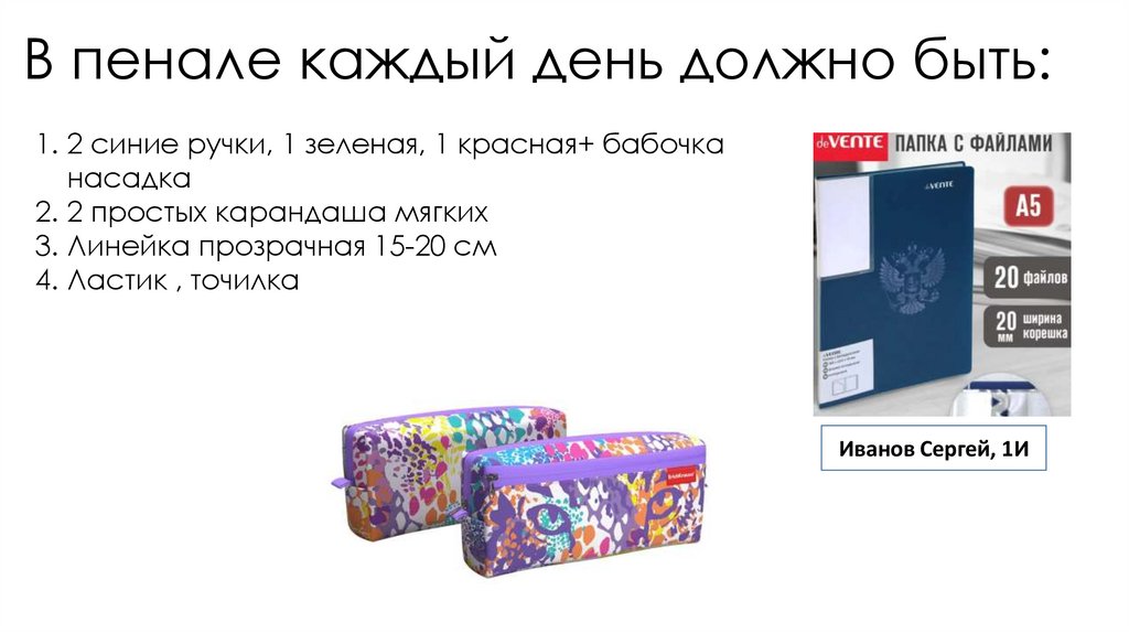 В пенале каждый день должно быть:1. 2 синие ручки, 1 зеленая, 1 красная+ бабочка