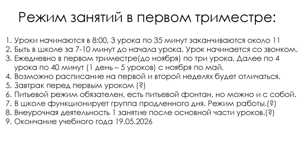 Режим занятий в первом триместре:1. Уроки начинаются в 8:00, 3 урока по 35 минут заканчиваются около 11