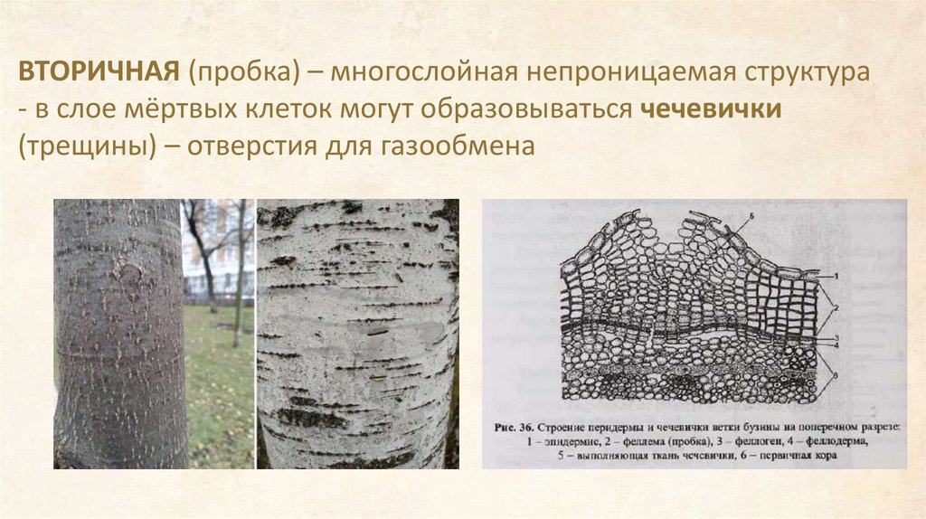 ВТОРИЧНАЯ (пробка) – многослойная непроницаемая структура- в слое мёртвых клеток могут образовываться чечевички