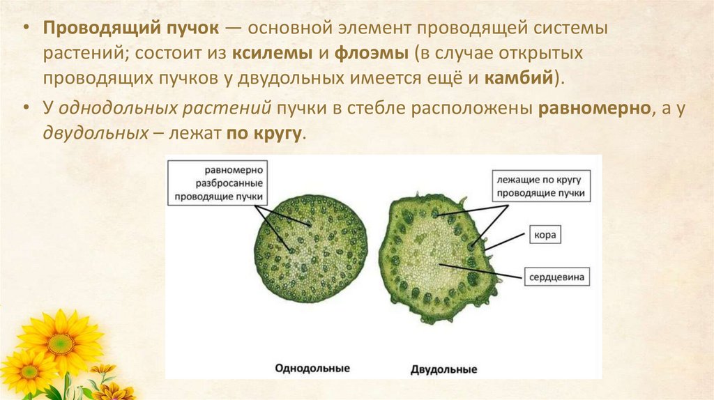 • У однодольных растений пучки в стебле расположены равномерно, а у
