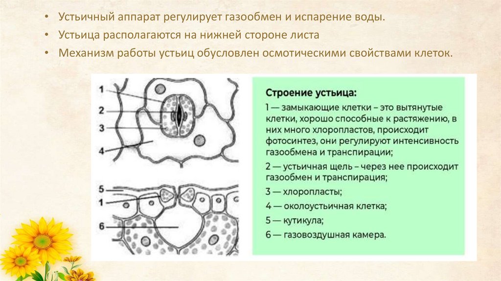 • Устьичный аппарат регулирует газообмен и испарение воды.• Устьица располагаются на нижней стороне листа