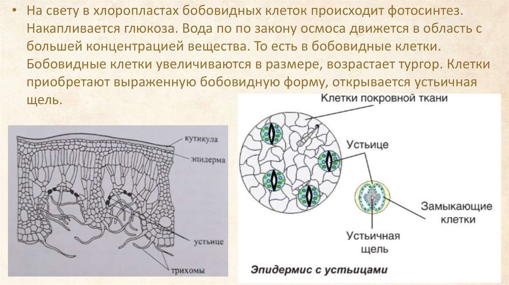 • Механизм работы устьиц обусловлен осмотическими свойствами клеток.