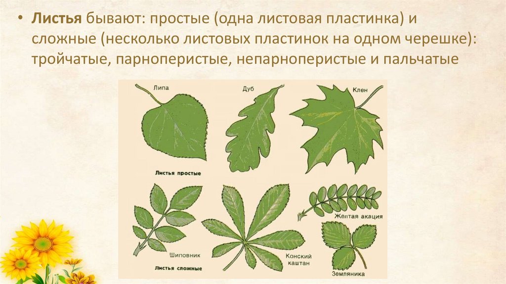 • Листья бывают: простые (одна листовая пластинка) исложные (несколько листовых пластинок на одном черешке):