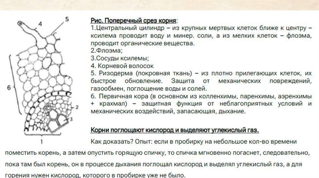 • корневые волоски ризодермы всасывают воду и минеральные вещества из почвы