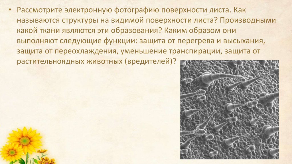 • Рассмотрите электронную фотографию поверхности листа. Какназываются структуры на видимой поверхности листа? Производными
