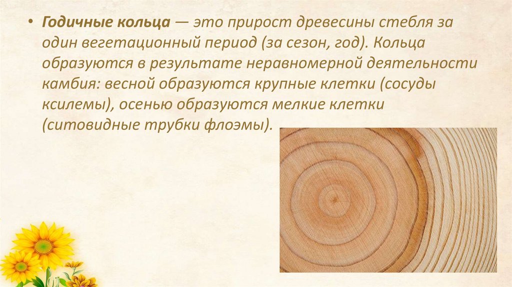 • Годичные кольца — это прирост древесины стебля заодин вегетационный период (за сезон, год). Кольца