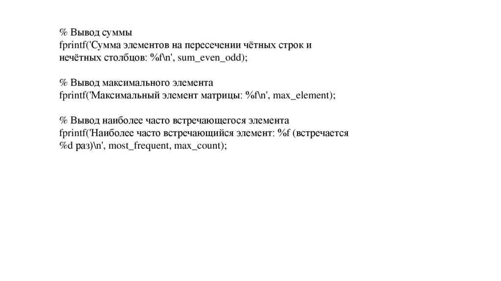 % Вывод суммыfprintf('Сумма элементов на пересечении чётных строк и