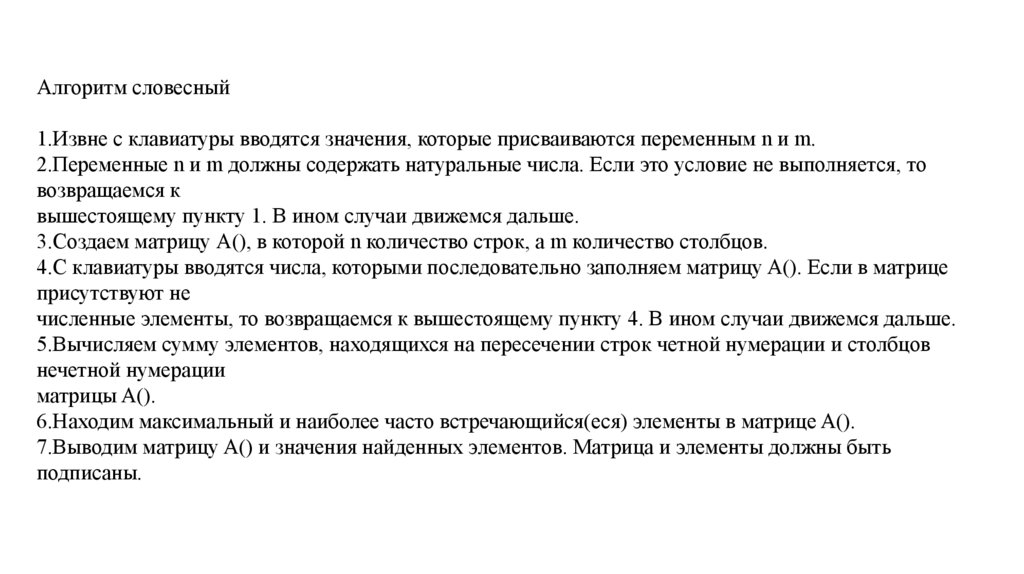 Алгоритм словесный1.Извне с клавиатуры вводятся значения, которые присваиваются переменным n и m.