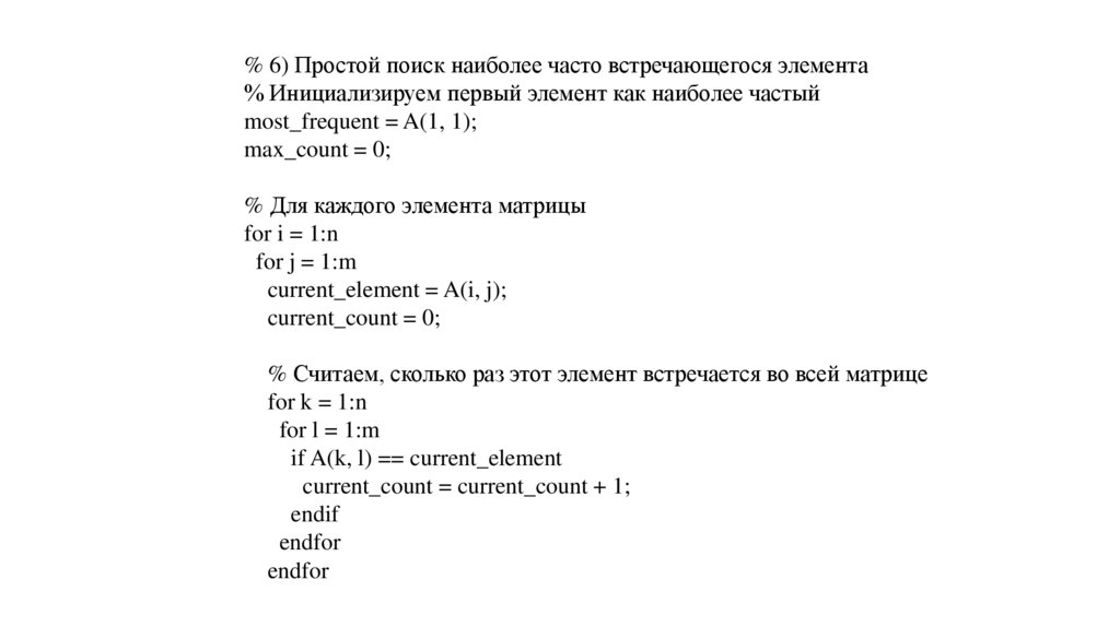 % 6) Простой поиск наиболее часто встречающегося элемента% Инициализируем первый элемент как наиболее частый