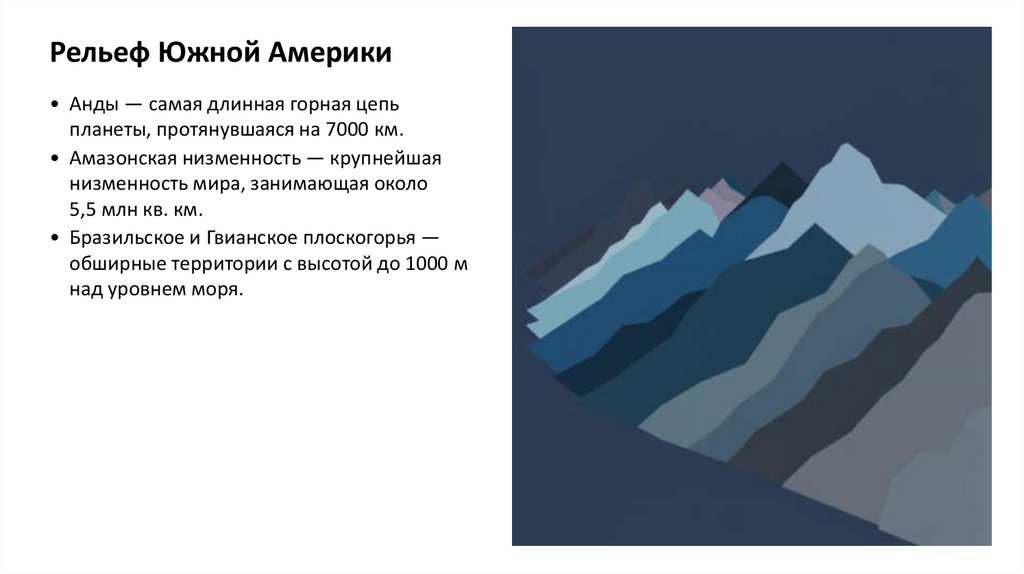 Рельеф Южной Америки• Анды — самая длинная горная цепь