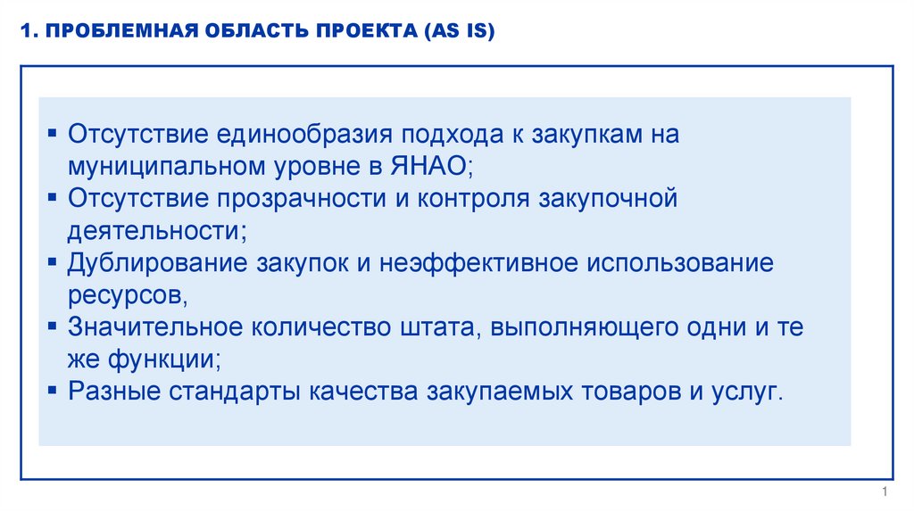 1. ПРОБЛЕМНАЯ ОБЛАСТЬ ПРОЕКТА (AS IS)Отсутствие единообразия подхода к закупкам на