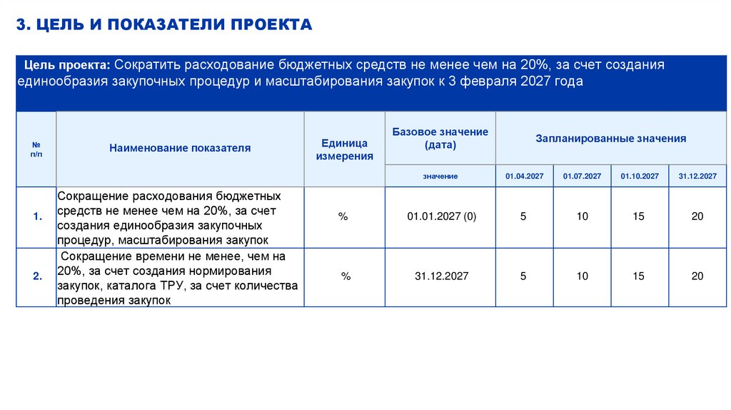 3. ЦЕЛЬ И ПОКАЗАТЕЛИ ПРОЕКТАЦель проекта: Сократить расходование бюджетных средств не менее чем на 20%, за счет создания