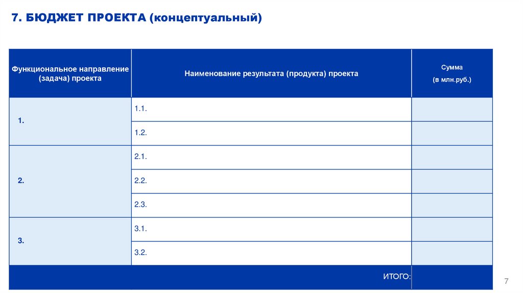 7. БЮДЖЕТ ПРОЕКТА (концептуальный)Функциональное направление