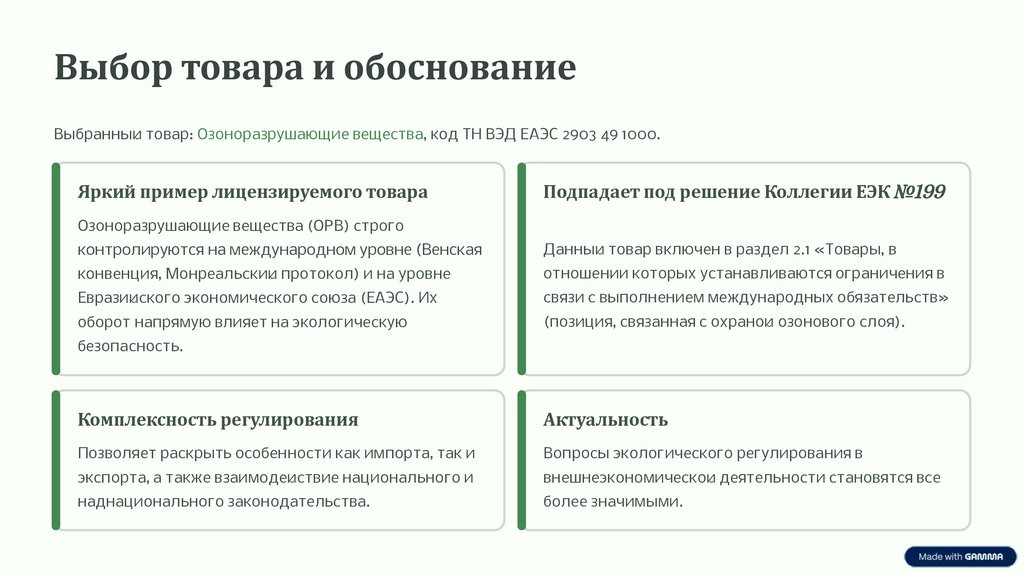 Выбор товара и обоснованиеВыбранный товар: Озоноразрушающие вещества, код ТН ВЭД ЕАЭС 2903 49 1000.