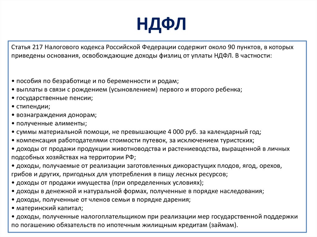 НДФЛСтатья 217 Налогового кодекса Российской Федерации содержит около 90 пунктов, в которых
