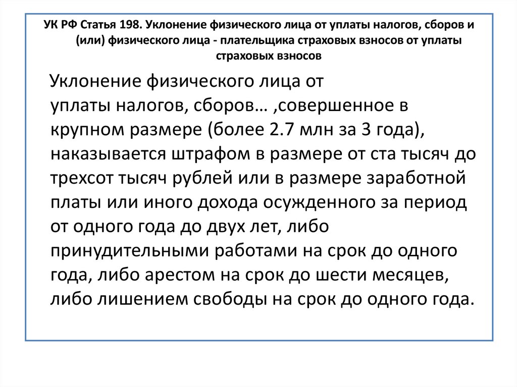 УК РФ Статья 198. Уклонение физического лица от уплаты налогов, сборов и(или) физического лица - плательщика страховых взносов от уплаты