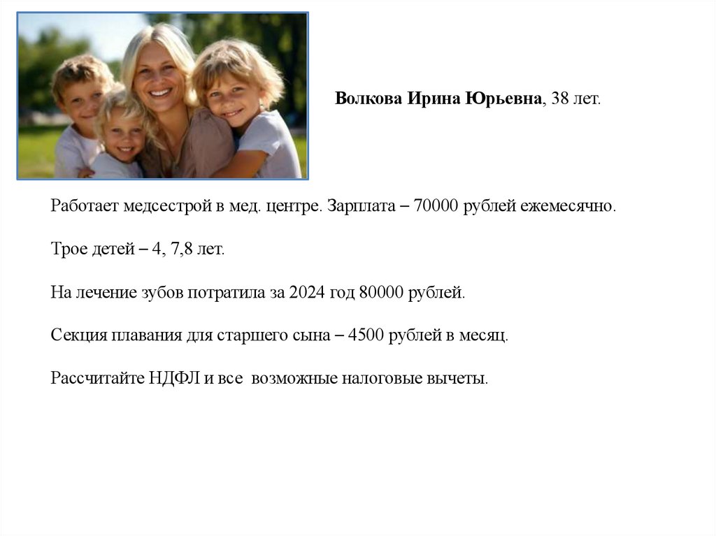 Пример:У Матвеевой Е.В. четверо детей 14, 12, 8 и 5 лет.