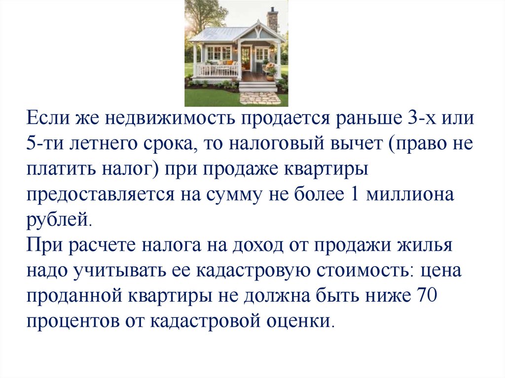 Если же недвижимость продается раньше 3-х или5-ти летнего срока, то налоговый вычет (право не