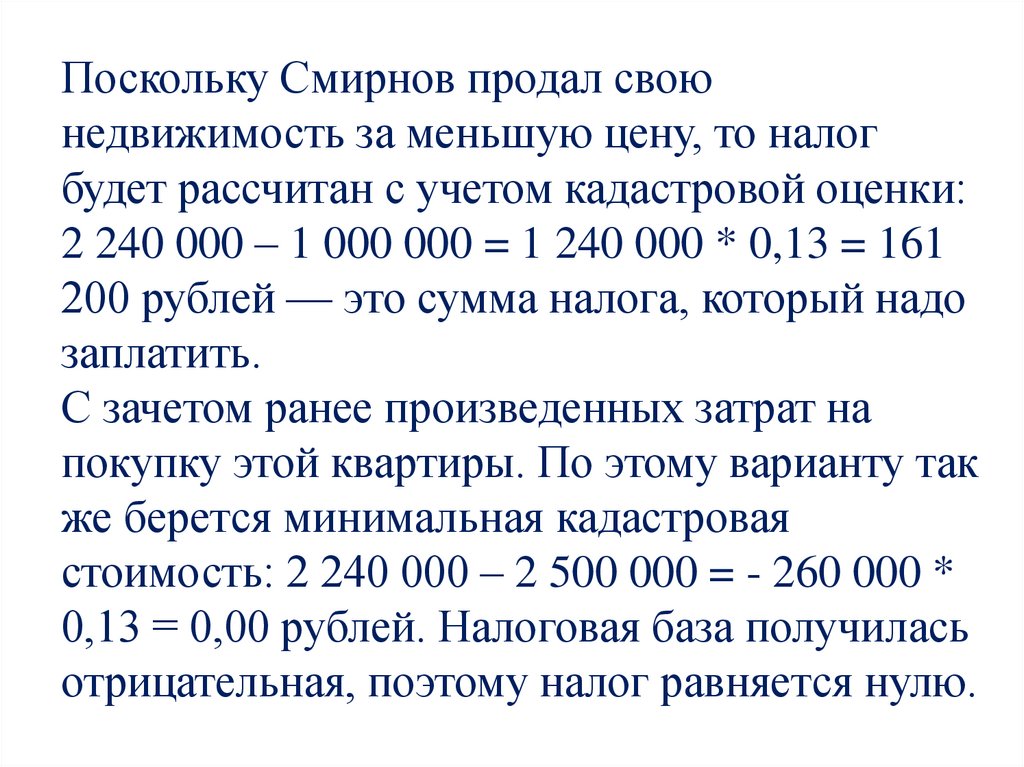 Поскольку Смирнов продал своюнедвижимость за меньшую цену, то налог