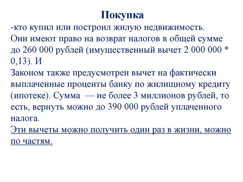вычет больше 260 тысяч рублей — до 300 тысяч