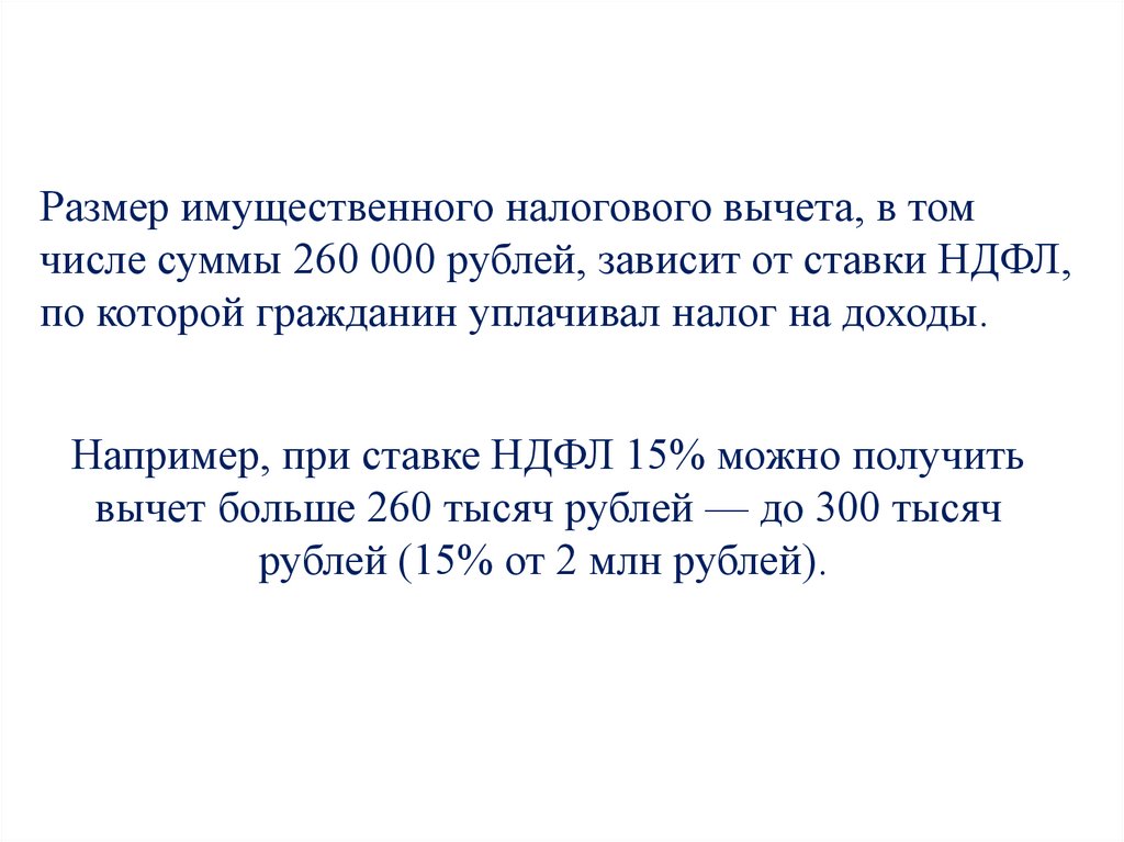 Размер имущественного налогового вычета, в томчисле суммы 260 000 рублей, зависит от ставки НДФЛ,