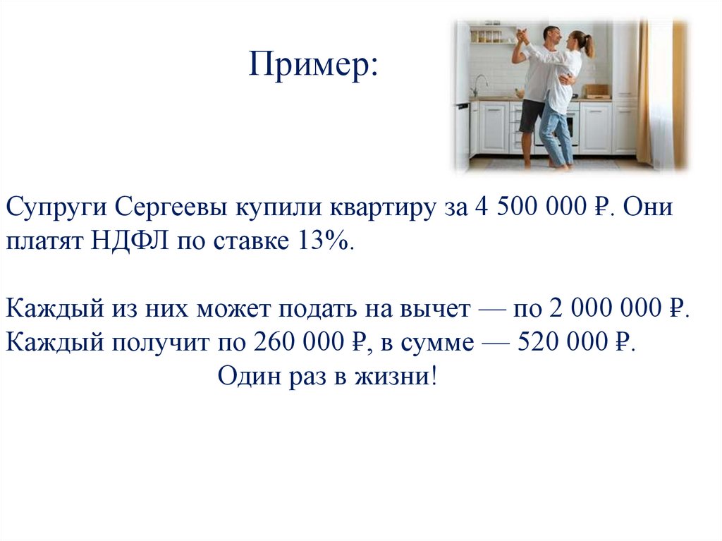 Пример:Супруги Сергеевы купили квартиру за 4 500 000 ₽. Они