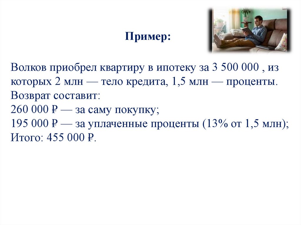 Пример:Волков приобрел квартиру в ипотеку за 3 500 000 , из