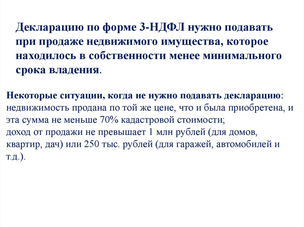 Декларацию по форме 3-НДФЛ нужно подаватьпри продаже недвижимого имущества, которое