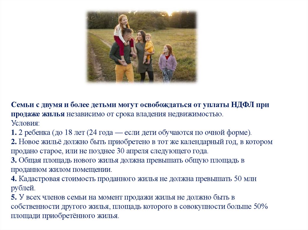 Семьи с двумя и более детьми могут освобождаться от уплаты НДФЛ припродаже жилья независимо от срока владения недвижимостью.