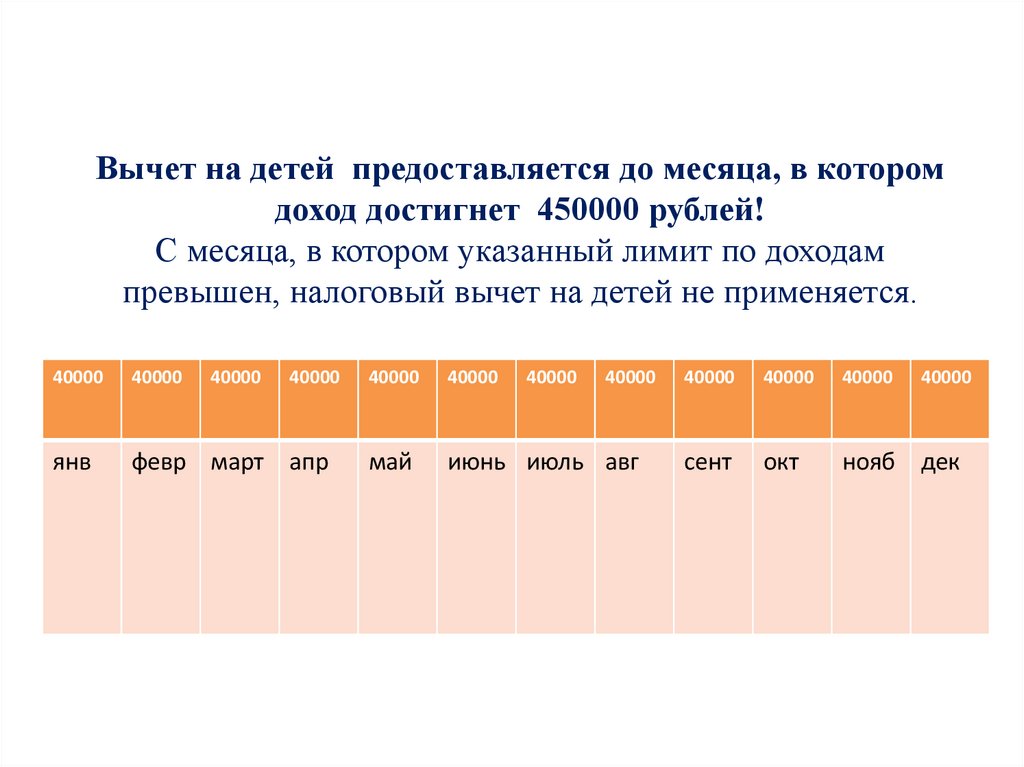 Вычет на детей предоставляется до месяца, в которомдоход достигнет 450000 рублей!