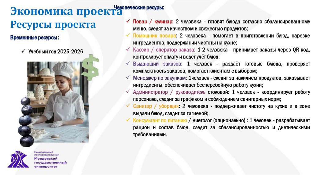 Помощник повара: 2 человека - помогает в приготовлении блюд, нарезке