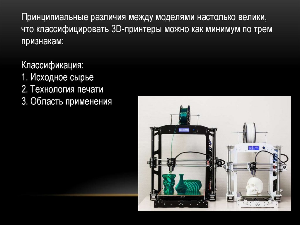 Принципиальные различия между моделями настолько велики,что классифицировать 3D-принтеры можно как минимум по трем