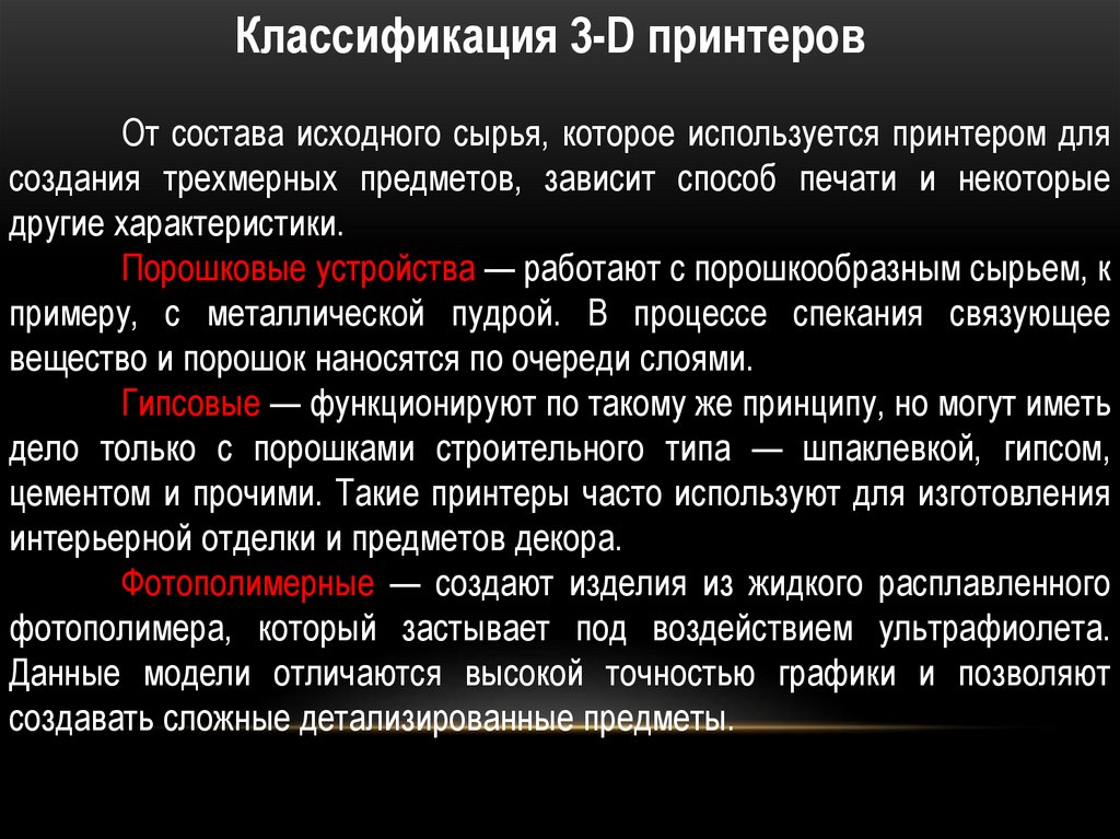 Классификация 3-D принтеровОт состава исходного сырья, которое используется принтером для