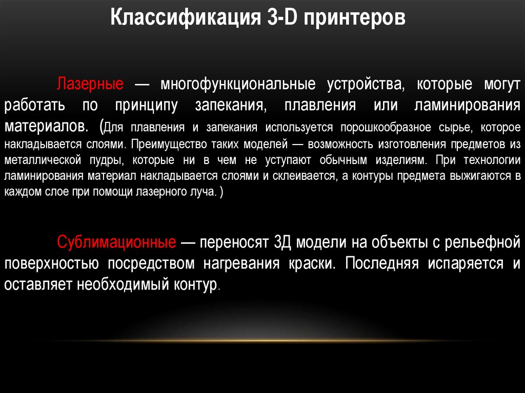 Классификация 3-D принтеровЛазерные — многофункциональные устройства, которые могут
