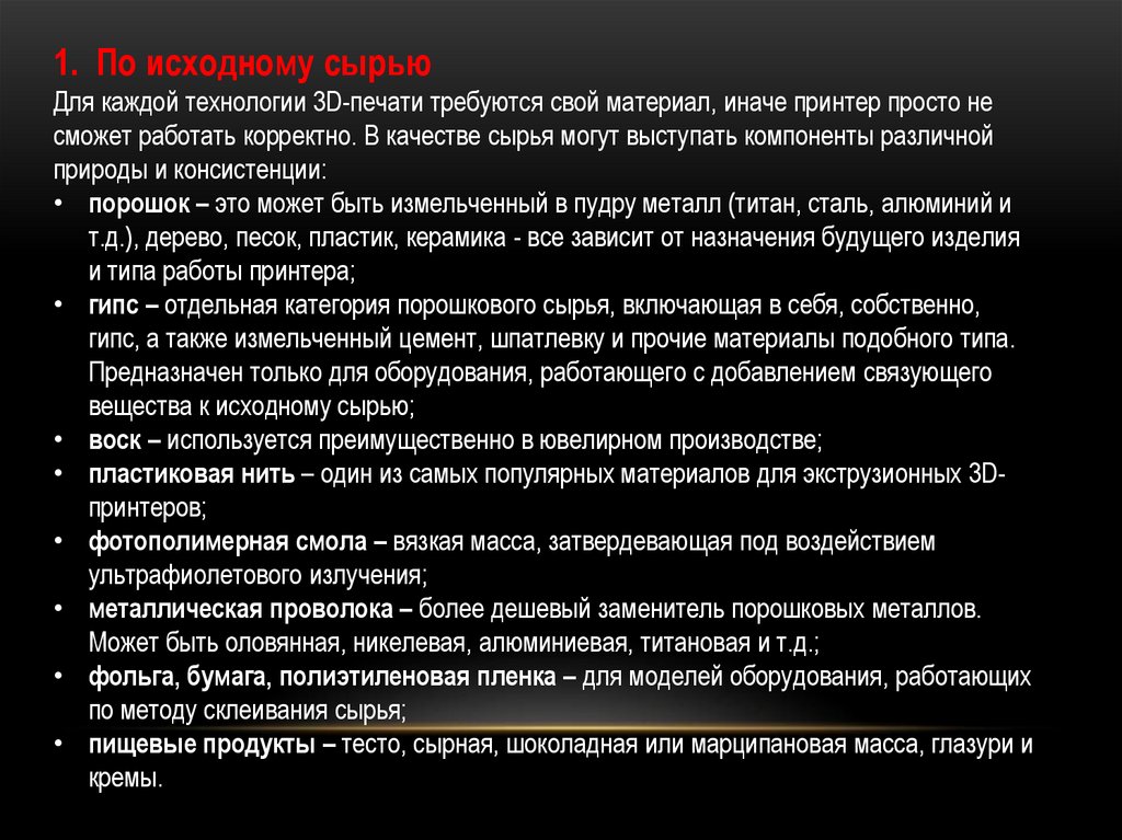 1. По исходному сырьюДля каждой технологии 3D-печати требуются свой материал, иначе принтер просто не