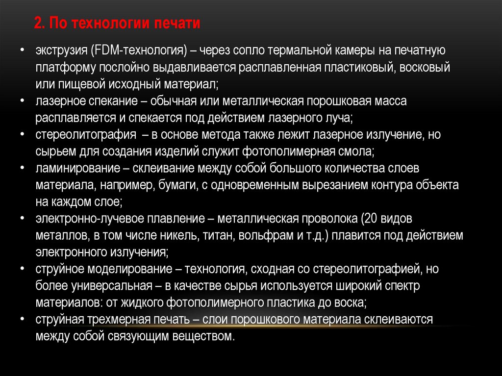 2. По технологии печати• экструзия (FDM-технология) – через сопло термальной камеры на печатную