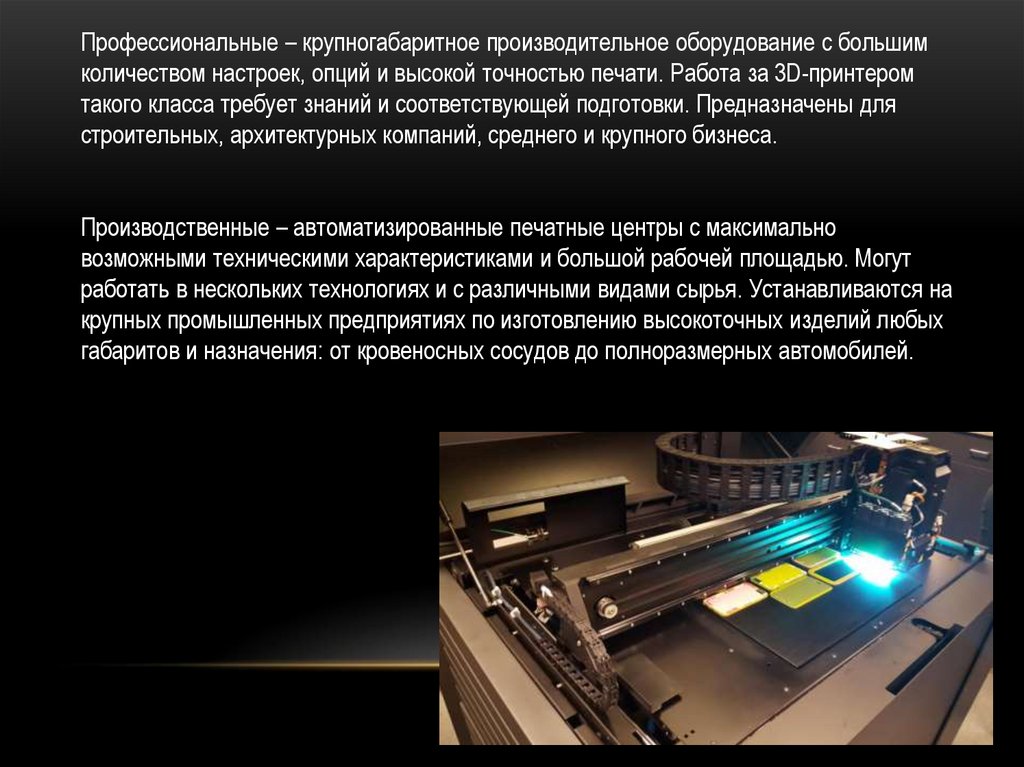 Профессиональные – крупногабаритное производительное оборудование с большимколичеством настроек, опций и высокой точностью печати. Работа за 3D-принтером